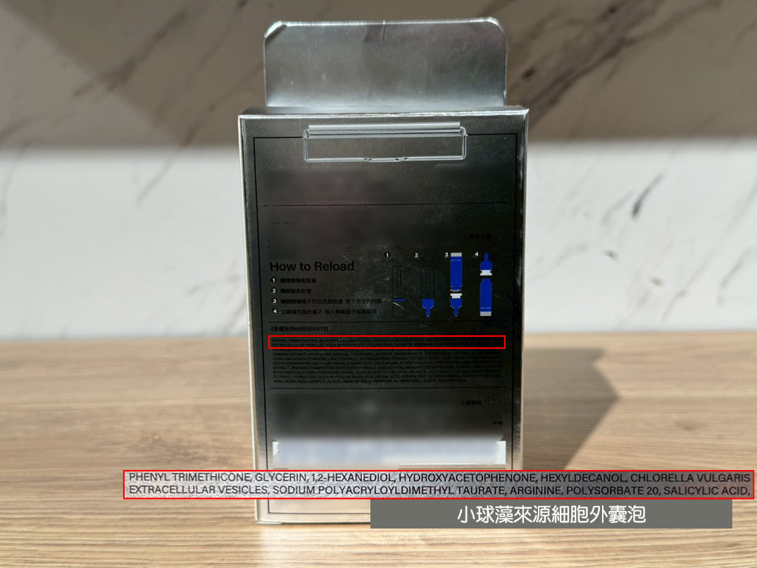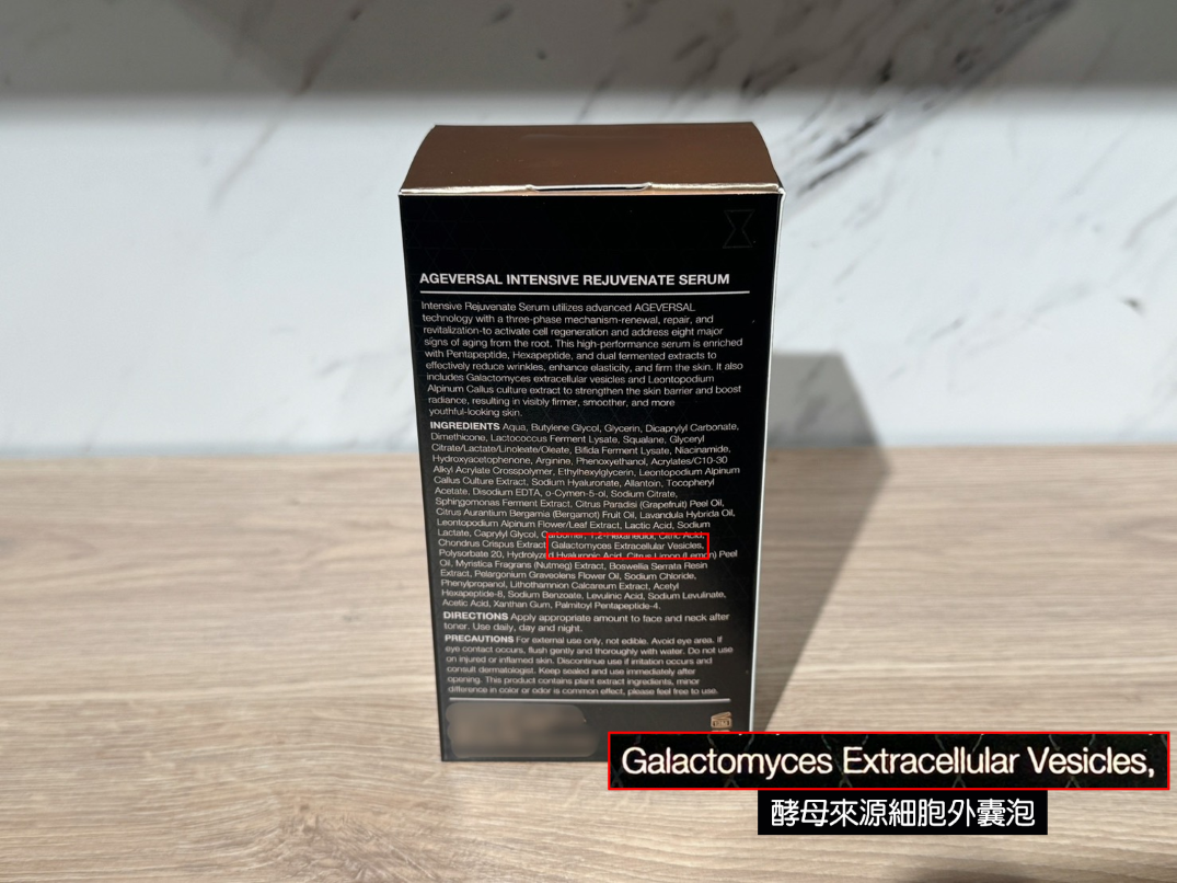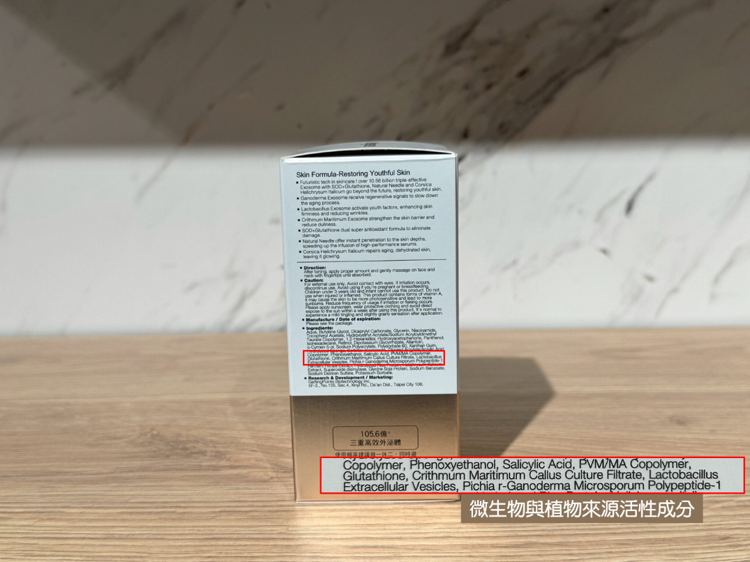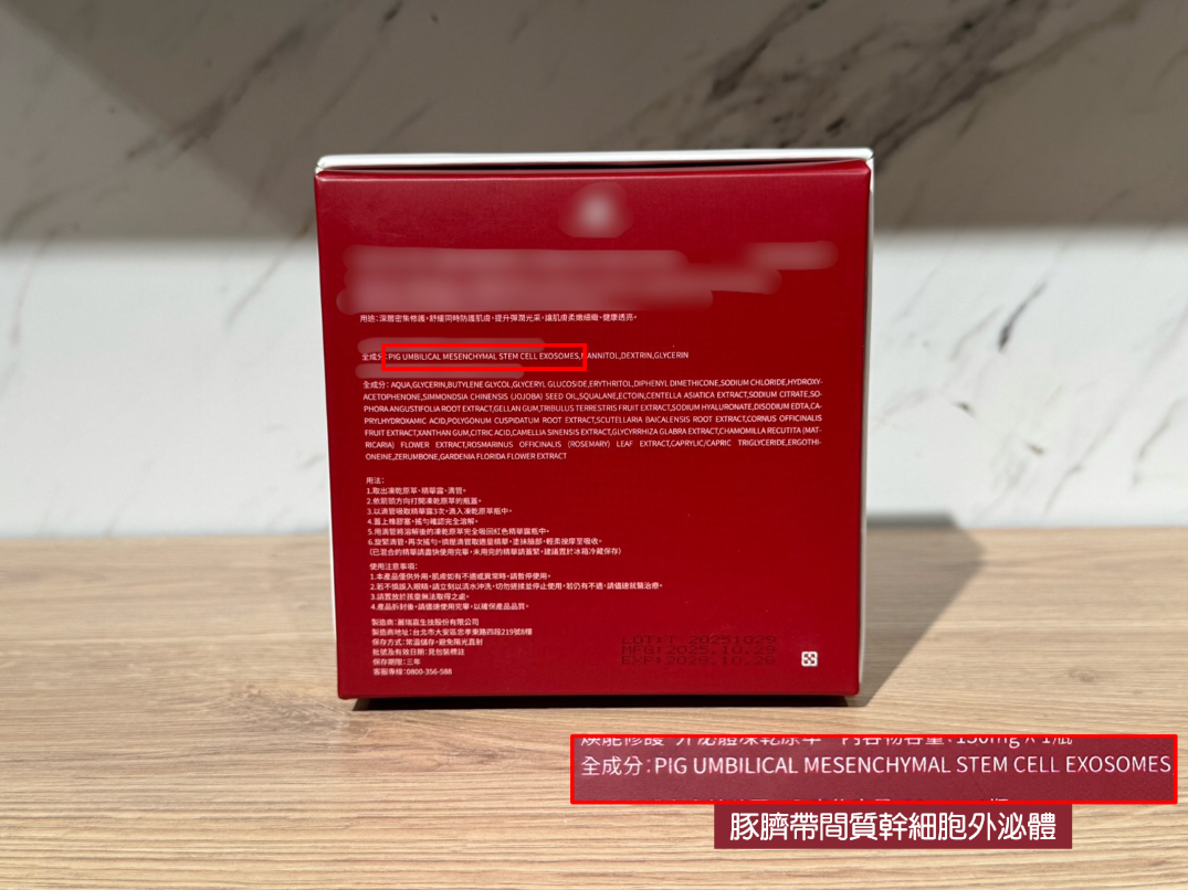 同時,產品全成分標示中明確揭露 Exosome(外泌體),並列於全成分第一位,清楚呈現其於配方設計中的核心定位。