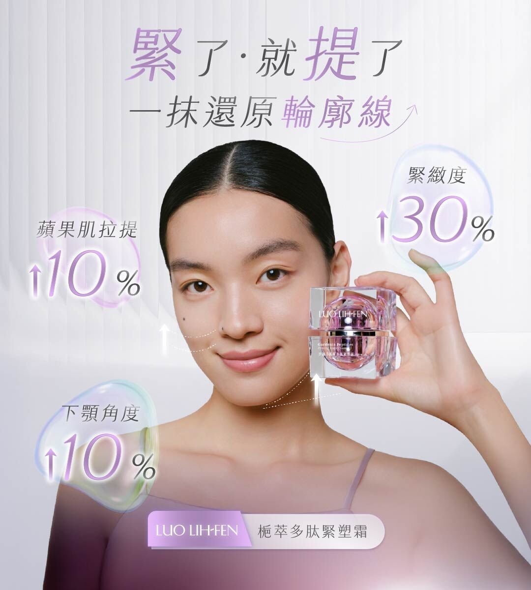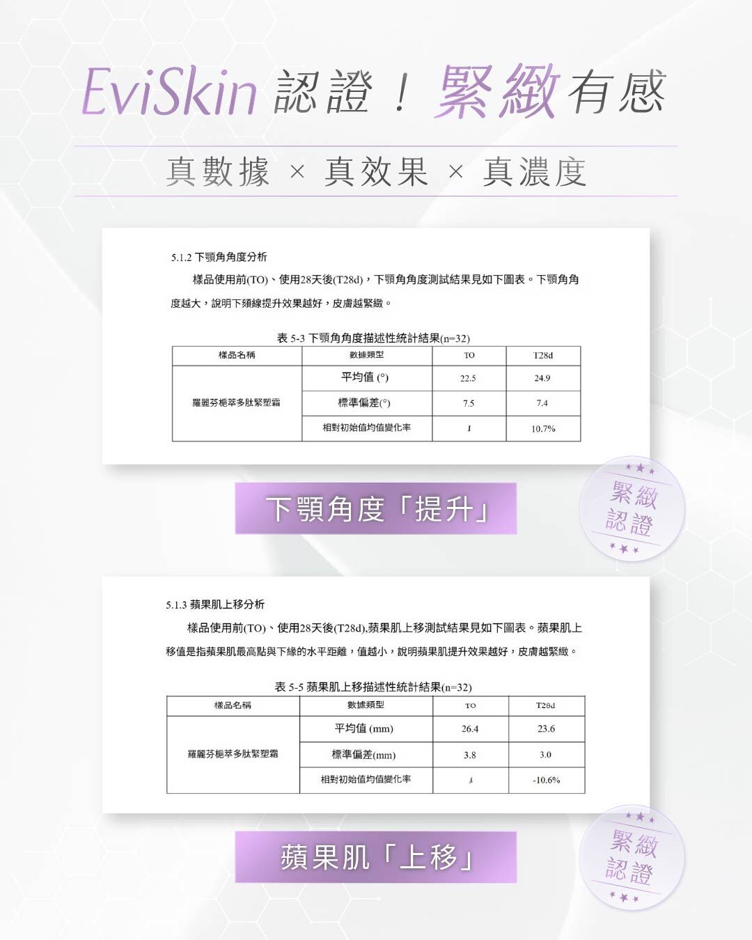 ● 緊緻度⬆30%、蘋果肌拉提⬆10%、下顎角度⬆10%