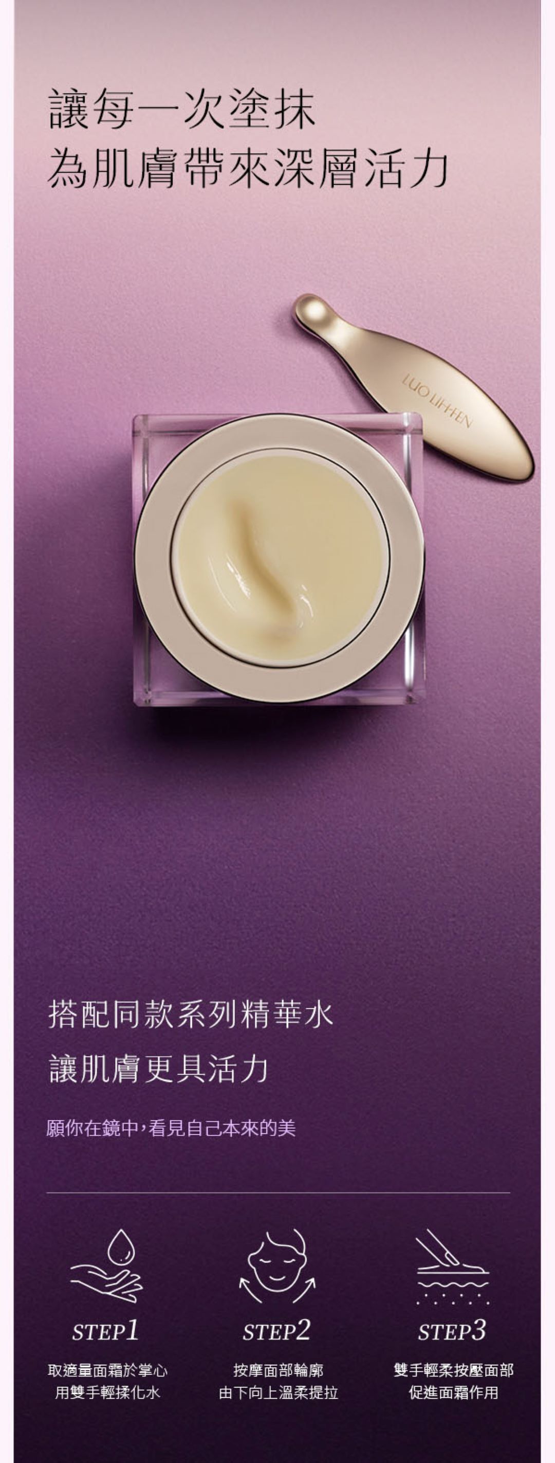 清潔臉部後,取適量均勻塗抹於臉部,輕柔按摩至吸收
