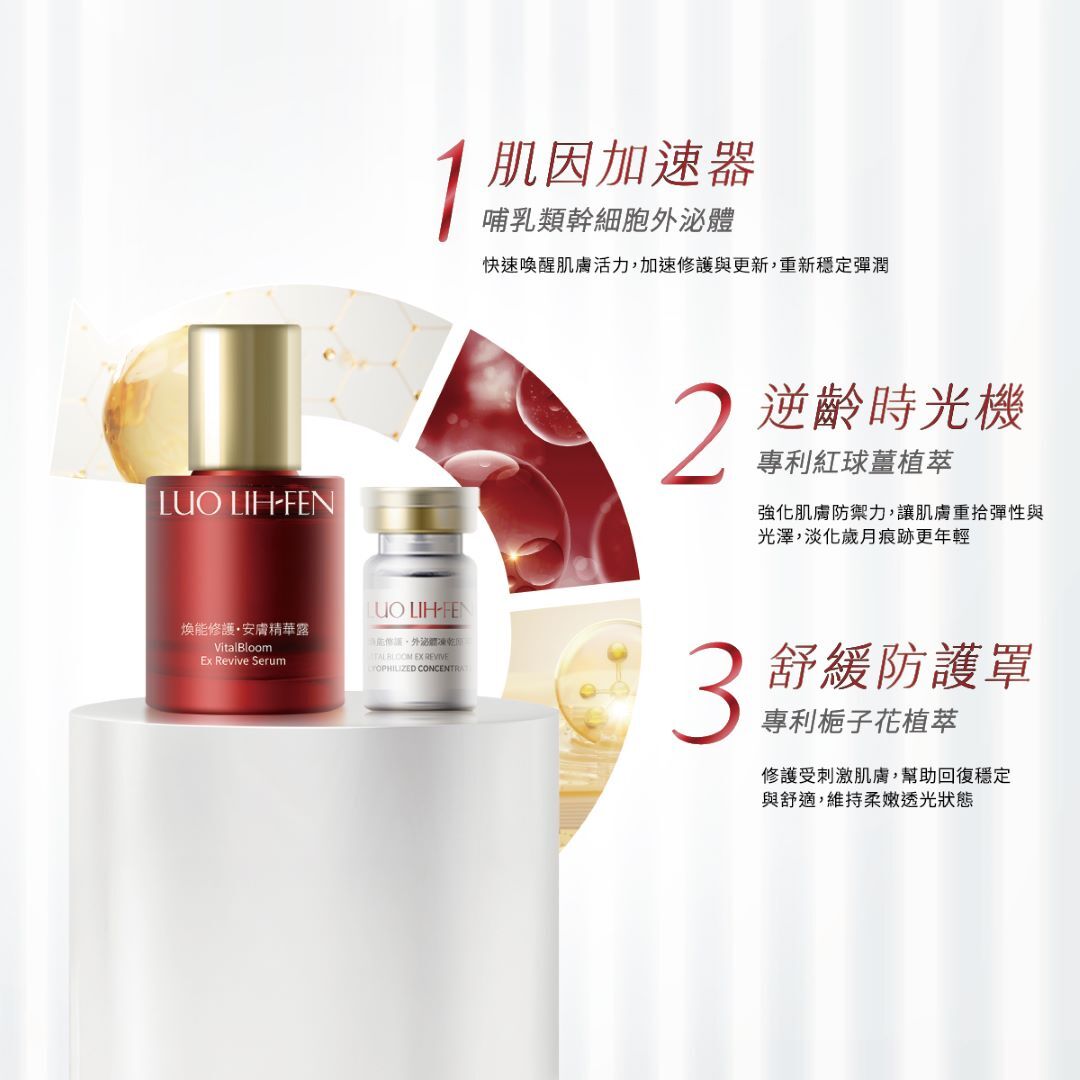 ※ 商品規格:內含煥能修護安膚精華露30ml*1+外泌體凍乾原萃150mg *1+羅麗芬梔萃多肽緊塑霜-經典正裝 50ml